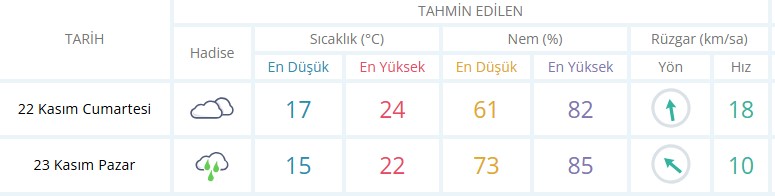 Pazar günü ise 22 derece olacak. Kentte sağanak yağışın etkili olması bekleniyor.