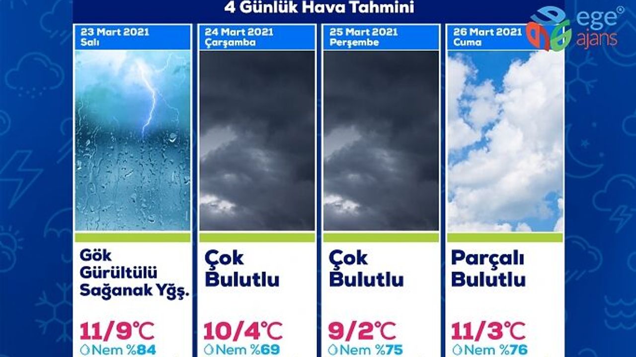22 Mart Pazartesi: Hava gök gürültülü sağanak yağışlı, sıcaklık en yüksek 18, en düşük 10 derece olacak.