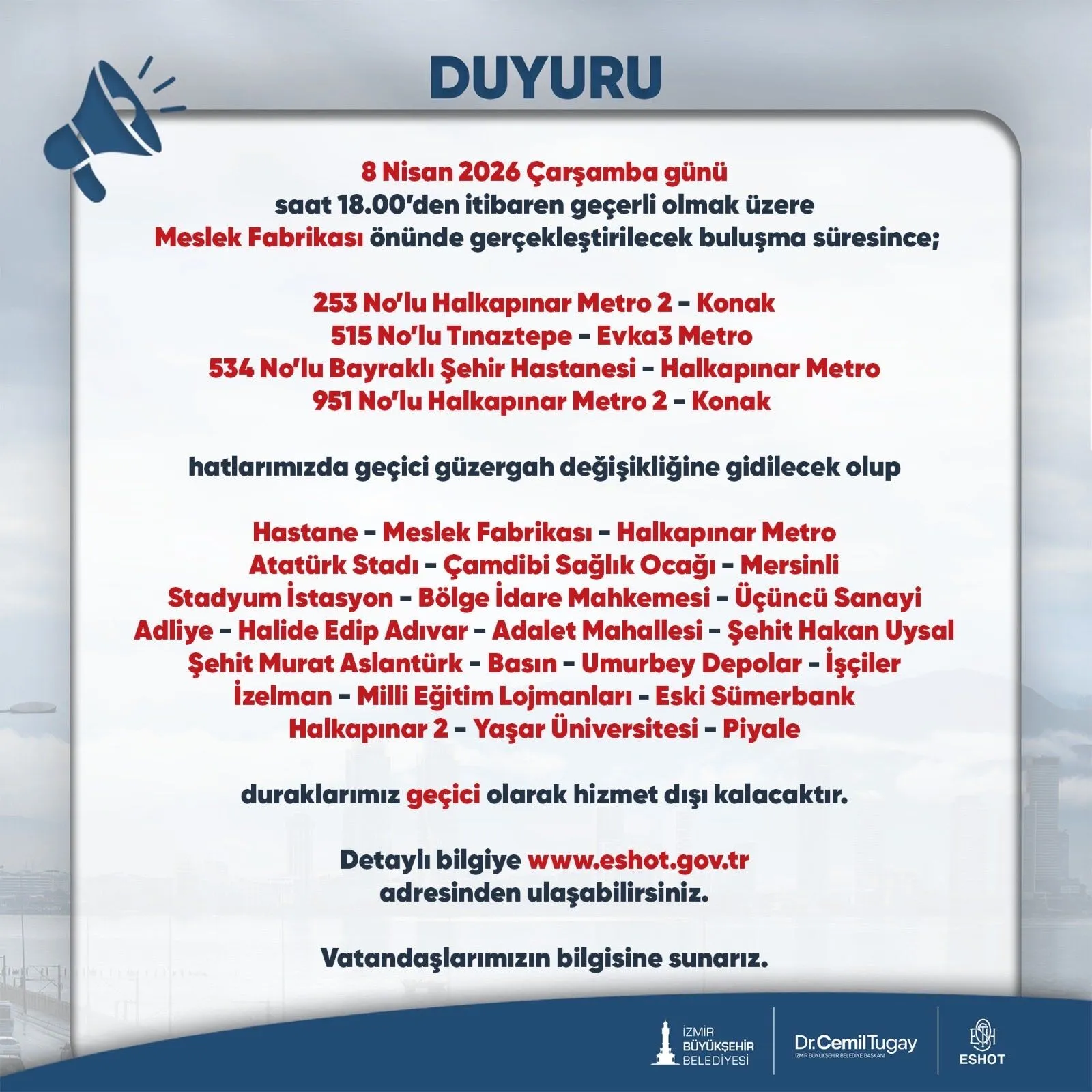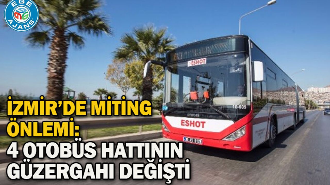 İzmir Büyükşehir Belediyesi’nden Vakıflar Genel Müdürlüğü’ne devrinin ardından polis eşliğinde tahliye edilen Meslek Fabrikası önünde düzenlenecek miting nedeniyle, kentte trafik akışında değişikliğe gidildi. Bugün saat 18.00'dan itibaren geçiçi olarak düzenleme kapsamında bazı otobüs hatlarının güzergahları değiştirildi.