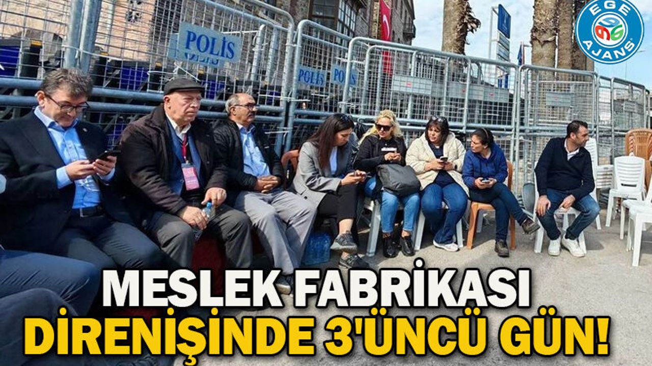Tapunun, İzmir Büyükşehir Belediyesi’nden Vakıflar Genel Müdürlüğü’ne geçmesinin ardından polis eşliğinde tahliye işlemleri yapılan Meslek Fabrikası önünde Büyükşehir Belediye Başkanı Cemil Tugay’ın başlatmış olduğu nöbet üçüncü günde de sürüyor.