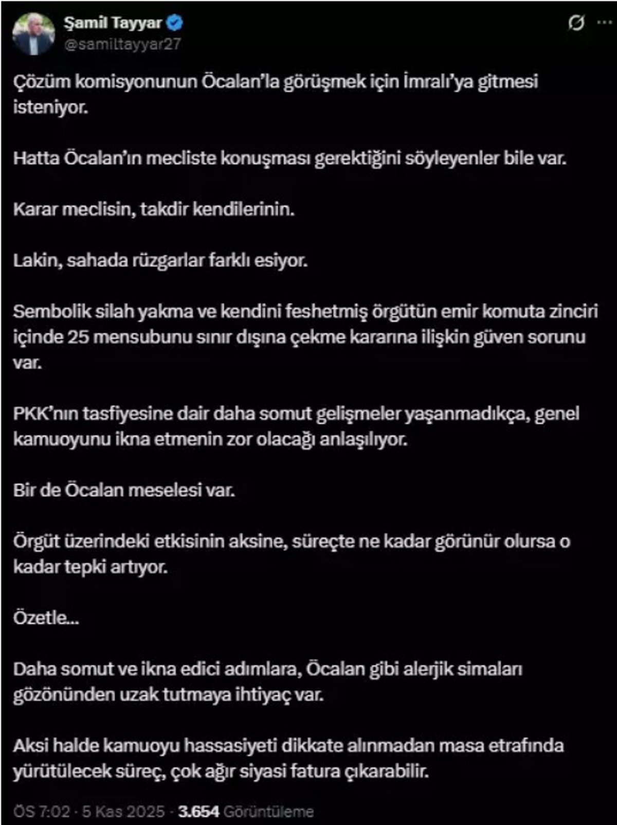 Tayyar, sosyal medya hesabından paylaştığı değerlendirmesinde, "Çözüm komisyonunun Öcalan'la görüşmek için İmralı'ya gitmesi isteniyor. Hatta Öcalan'ın Meclis'te konuşması gerektiğini söyleyenler bile var. Karar Meclis'in, takdir kendilerinin. Lakin sahada rüzgarlar farklı esiyor." dedi.